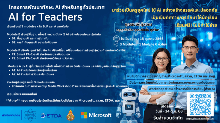 สสวท. – Microsoft – ETDA ชวนครูทั่วประเทศอบรมฟรี “AI for Teachers” ยกระดับครูไทยสู่ยุคดิจิทัล สมัครได้ถึง 14 ตุลาคม 2568 นี้ 10 ต.ค. 68 16:19