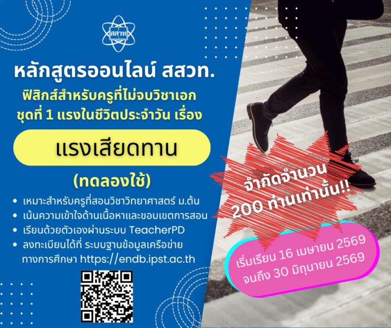 สสวท. เปิดหลักสูตรฟิสิกส์ออนไลน์ “แรงเสียดทาน” เสริมฟิสิกส์ครูไม่ตรงเอก ระดับ ม.ต้น รับจำนวนจำกัด 17 เม.ย. 69 8:52