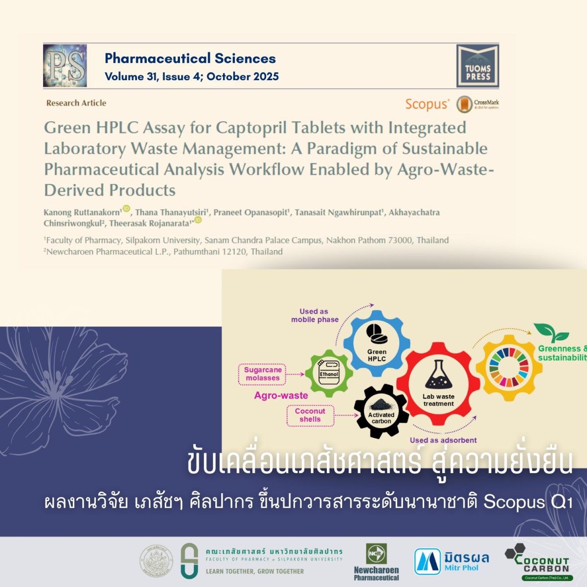ในยุคที่โลกมุ่งสู่การพัฒนาอย่างยั่งยืนและลดผลกระทบต่อสิ่งแวดล้อม คณะเภสัชศาสตร์ มหาวิทยาลัยศิลปากรสร้างนวัตกรรมใหม่ที่เปลี่ยน”ของเหลือจากเกษตรกรรมไทย”ให้กลายเป็นหัวใจสำคัญของการตรวจวิเคราะห์คุณภาพยาโดยประสบความสำเร็จในการพัฒนาระบบตรวจวิเคราะห์ยารักษาโรคหัวใจและความดันโลหิตสูง “Captopril”ด้วยกระบวนการที่เป็นมิตรต่อสิ่งแวดล้อมอย่างครบวงจร ซึ่งไม่เพียงช่วยลด การใช้สารเคมีอันตรายแต่ยังลดระยะเวลาการตรวจวิเคราะห์จากเดิม 14 นาที เหลือเพียง 2.5 นาที พร้อมวางรากฐานต้นแบบ”ห้องปฏิบัติการสีเขียว” เพื่อความปลอดภัยของบุคลากรและความยั่งยืนในระยะยาวผลงานวิจัยนี้นำโดย รองศาสตราจารย์ ดร.ธีรศักดิ์ โรจนราธา และทีมวิจัยจากคณะเภสัชศาสตร์มหาวิทยาลัยศิลปากร ซึ่งได้ปฏิวัติกระบวนการตรวจวิเคราะห์ยาแบบดั้งเดิมที่ต้องพึ่งพาสารเคมีอันตรายด้วยการเปลี่ยนมาใช้ “เอทานอลชีวภาพ” หรือ “ไบโอเอทานอล” ที่ผลิตจากกากน้ำตาลอ้อยซึ่งได้รับการสนับสนุนจาก บริษัท มิตรผล ไบโอฟูเอล จำกัด ช่วยลดต้นทุนการดำเนินงานและลดความเสี่ยงต่อผู้ปฏิบัติงานได้อย่างมีนัยสำคัญนอกจากนี้ ทีมวิจัยยังพัฒนาแนวทางจัดการของเสียจากห้องปฏิบัติการอย่างครบวงจร โดยใช้”ถ่านกัมมันต์จากกะลามะพร้าว” ซึ่งได้รับการสนับสนุนจาก บริษัท โคโคนัท คาร์บอน (ไทย) จำกัดมาใช้ในการดูดซับสารตกค้างของยาในน้ำทิ้งได้อย่างมีประสิทธิภาพสูงถึง 99% ภายในเวลาเพียง 5 นาทีช่วยป้องกันการปนเปื้อนของยาในสิ่งแวดล้อมและเป็นตัวอย่างการนำวัสดุเหลือใช้ทางการเกษตรกลับมาใช้ประโยชน์ตามแนวคิด เศรษฐกิจหมุนเวียน (Circular Economy)รองศาสตราจารย์ ดร. เภสัชกรธีรศักดิ์ โรจนราธา หัวหน้าโครงการวิจัย กล่าวว่า”เมื่อความยั่งยืนไม่ใช่ทางเลือก แต่คือทิศทางใหม่ของโลกงานวิจัยนี้จึงนำเสนอต้นแบบของวิชาชีพเภสัชกรรมในบทบาทใหม่ ที่ขยายจากการดูแลสุขภาพด้วยยาคุณภาพ