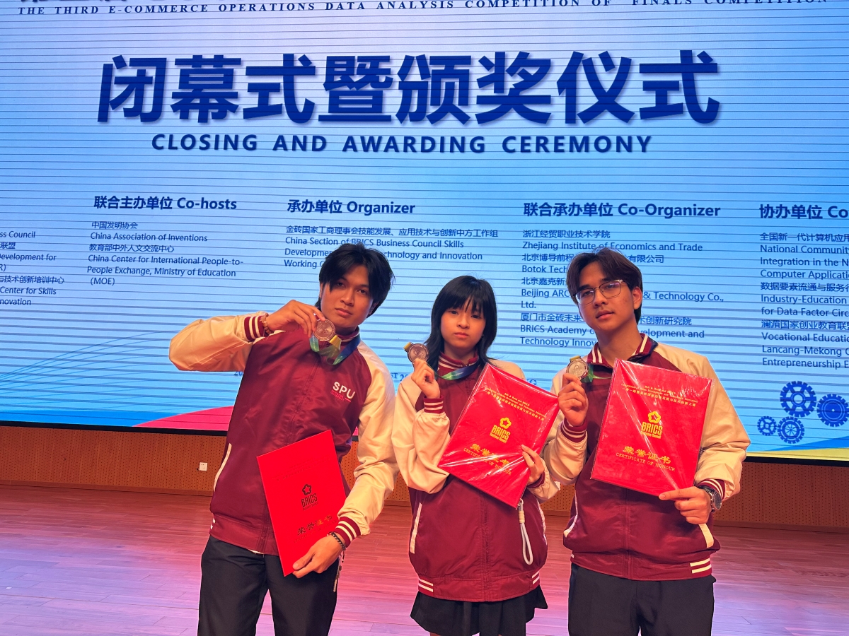 การแข่งขันเวทีแรก “2025 Belt & Road and BRICS Competition of Skills Development and Technology Innovation – Track of E-commerce Operations Data Analysis Competition” นับเป็นเวทีระดับนานาชาติที่ยิ่งใหญ่ด้าน E-commerce Intelligence และ Data Analytics จัดขึ้นที่เมืองหางโจว ศูนย์กลางอีคอมเมิร์ซระดับโลก ซึ่งทีมนักศึกษาชมรม “AI Spark Club” จากคณะเทคโนโลยีสารสนเทศ SPU นำโดย อาจารย์มาสวีร์ มาศดิศรโชติ และ อาจารย์ทิพย์อรุณ เขี้ยวแก้ว พร้อมด้วยนักศึกษา ได้แก่ นายคุณาธิป อู่ทอง และ นายประธาน นิลสนธิ์ สาขาวิทยาการคอมพิวเตอร์และนวัตกรรมการพัฒนาซอฟต์แวร์ รวมถึง นางสาวนิตย์ฌิมา แซ่โคว้ วิทยาลัยนานาชาติ ใช้ความสามารถสร้างผลงานวิเคราะห์ข้อมูลเชิงกลยุทธ์ด้านอีคอมเมิร์ซได้อย่างโดดเด่น จนคว้ารางวัลรองชนะเลิศอันดับ 2 (Second Runner-up) มาครองได้สำเร็จ พร้อมด้วยรางวัล Outstanding Instructor Award สำหรับอาจารย์ และรางวัล Outstanding Organization Award มอบให้แก่ มหาวิทยาลัยศรีปทุม