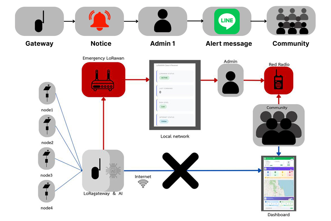 ระบบนี้ถูกออกแบบให้ทำงานผ่านเครือข่ายการสื่อสาร 2 ระดับ เพื่อให้มั่นใจได้ว่าการแจ้งเตือนจะดำเนินไปอย่างต่อเนื่องในทุกสถานการณ์ โดยในภาวะปกติ อุปกรณ์เกตเวย์จะส่งข้อมูลจากโหนดเซ็นเซอร์ทั้ง 5 จุด ไปยังผู้ดูแลระบบเพื่อวิเคราะห์ความเสี่ยงด้วย AI ก่อนแจ้งเตือนผ่านแอปพลิเคชัน LINE และหน้าจอสรุปผลของเว็บไซต์ (Web Dashboard) แบบเรียลไทม์ ส่วนในภาวะฉุกเฉิน (ไฟฟ้าดับ/อินเทอร์เน็ตล่ม) ระบบสื่อสารสำรอง LoRaWAN จะส่งสัญญาณเตือนภัยโดยตรงไปยังผู้ดูแลระบบ ซึ่งจะใช้วิทยุสื่อสาร (ว.แดง) กระจายข่าวแจ้งเตือนประชาชนในพื้นที่ทันที