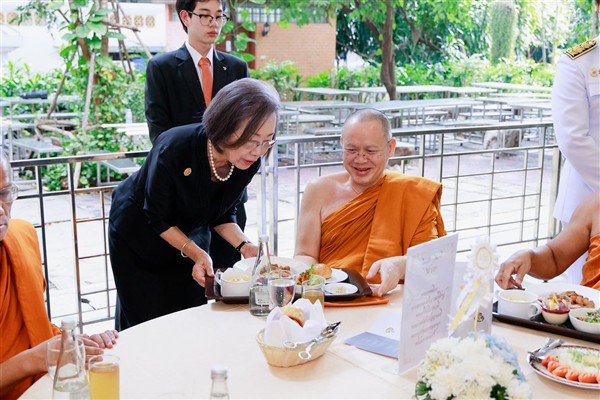 ในโอกาสนี้ คุณหญิงกษมา วรวรรณ ณ อยุธยา นายกสภาวิทยาลัยดุสิตธานี ร่วมด้วย คุณชนินทธ์ โทณวณิก ประธานกรรมการและประธานเจ้าหน้าที่บริหารกลุ่ม บริษัท ดุสิตธานี จำกัด (มหาชน) และอุปนายกสภาวิทยาลัยดุสิตธานี ดร.พิศาล สร้อยธุหร่ำ กรรมการสภาวิทยาลัยผู้ทรงคุณวุฒิวิทยาลัยดุสิตธานี และ ดร.อรรถเวทย์ พฤกษ์สถาพร อธิการบดีวิทยาลัยดุสิตธานี ได้นำคณาจารย์และนักศึกษาสาขาศิลปะการประกอบอาหาร ไปปรุงอาหารทั้งคาวและหวานเพื่อถวายเป็นภัตตาหารเพลแด่พระสงฆ์ที่สวดพระพุทธมนต์ พระสงฆ์ที่มาติกา-สดับปกรณ์ และพระภิกษุสามเณรวัดปทุมวนาราม รวมจำนวน 110 รูป ในขณะที่คณาจารย์และนักศึกษาสาขาการจัดการโรงแรมทำหน้าที่เป็นผู้ให้บริการ โดยมีคณะจากสถาบันเทคโนโลยีจิตรลดาร่วมด้วย