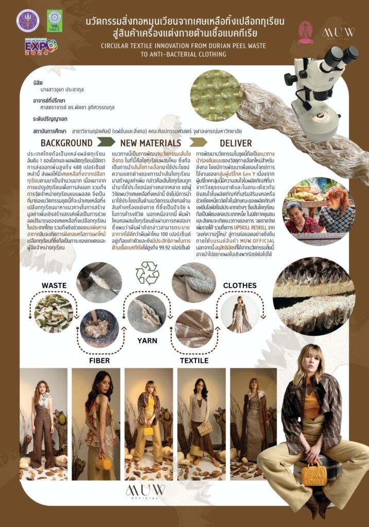 ดุษฎีบัณฑิตจุฬาฯ พัฒนาผลิตภัณฑ์แฟชั่นจากเปลือกทุเรียนเหลือทิ้ง คุณสมบัติระบายอากาศได้ดีกว่าผ้าไหมล้วน และต้านเชื้อแบคทีเรียได้เกือบ 100 % หวังสร้างมูลค่าเพิ่มทางเศรษฐกิจ หนุน Soft Power ไทยสู่เวทีโลกด้วยแบรนด์ MUW เสื้อผ้าแฟชั่นที่ผสานธรรมชาติ ศิลปะ และความเชื่อสายมูอย่างลงตัว นวัตกรรมคว้ารางวัลดีเด่นจากงานมหกรรมงานวิจัยแห่งชาติ 2567