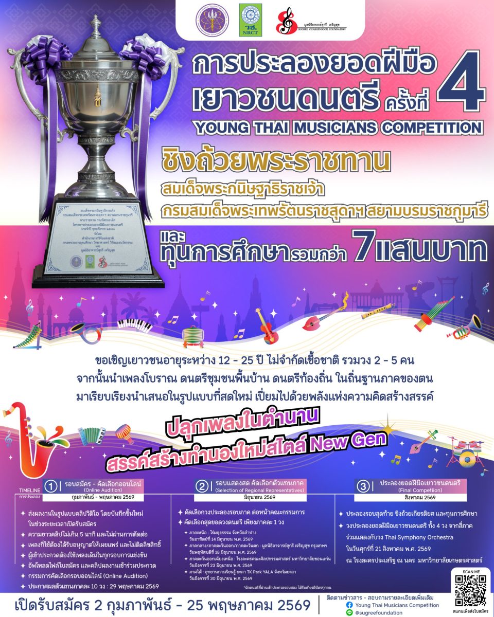 สำนักงานการวิจัยแห่งชาติ (วช.) และมูลนิธิอาจารย์สุกรี เจริญสุข ขอเชิญชวนเยาวชนอายุระหว่าง 12 – 25 ปี ไม่จำกัดเชื้อชาติ รวมวง 2 – 5 คน เข้าร่วมการประลองยอดฝีมือเยาวชนดนตรี Season 4 ชิงถ้วยพระราชทาน สมเด็จพระกนิษฐาธิราชเจ้า กรมสมเด็จพระเทพรัตนราชสุดาฯ สยามบรมราชกุมารี และทุนการศึกษา รวมกว่า 7 แสนบาท มาปล่อยพลังสร้างสรรค์ผ่านเสียงดนตรีพื้นบ้าน ดนตรีท้องถิ่น ดนตรีของชุมชน ในถิ่นฐานภาคของตน โดยการเรียบเรียงและการนำเสนอในรูปแบบที่สดใหม่ เปี่ยมไปด้วยพลังแห่งความคิดสร้างสรรค์