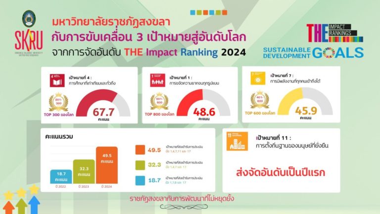 มรภ.สงขลา เดินหน้าขับเคลื่อน SDGs รับการจัดอันดับ THE Impact Rankings 2024 สุดปลื้ม คะแนนรวม 49.5 เพิ่มสูงขึ้นต่อเนื่อง 18 มิ.ย. 67 10:55