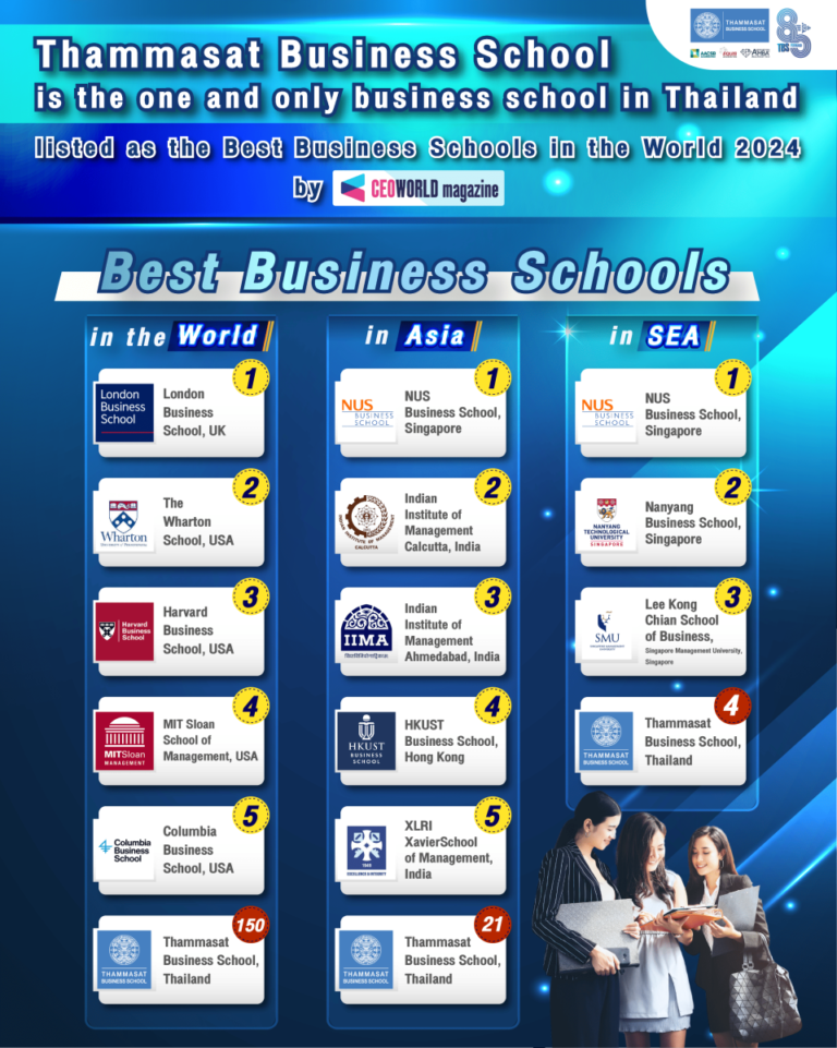 Thammasat Business School is the one and only business school in Thailand listed as the Best Business Schools in the World 2024. 3 เม.ย. 67 15:22