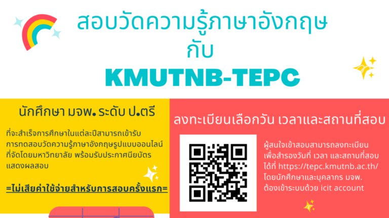 ศูนย์ทดสอบวัดความสามารถภาษาอังกฤษ (KMUTNB-TEPC) เปิดรับสมัครสอบวัดผลภาษาอังกฤษ แก่นักศึกษา บุคลากร และบุคคลภายนอก 9 ส.ค. 66 14:10