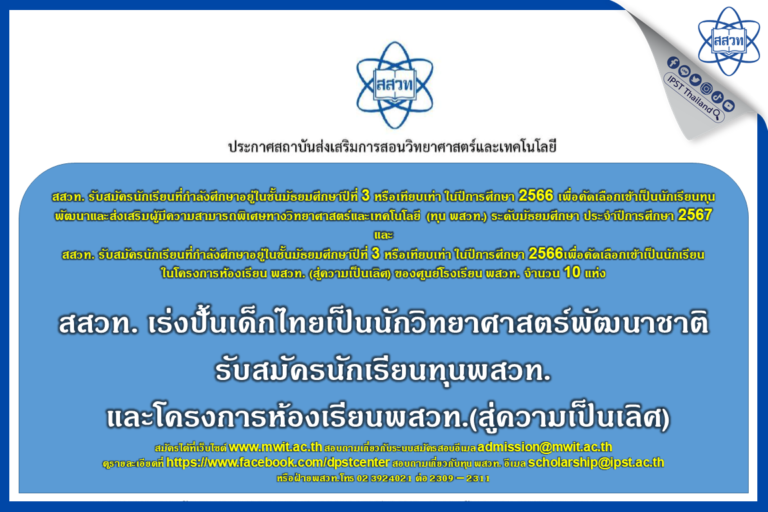 สสวท. เร่งปั้นเด็กไทยเป็นนักวิทยาศาสตร์พัฒนาชาติ รับสมัครนักเรียนทุนพสวท. และโครงการห้องเรียนพสวท.(สู่ความเป็นเลิศ) 4 ส.ค. 66 16:17