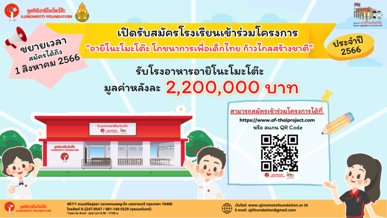 มูลนิธิอายิโนะโมะโต๊ะ ขยายเวลาเปิดรับสมัครโรงเรียนเข้าร่วมโครงการ เพื่อรับงบก่อสร้างโรงอาหาร 2.2 ล้านบาท 19 ก.ค. 66 9:05