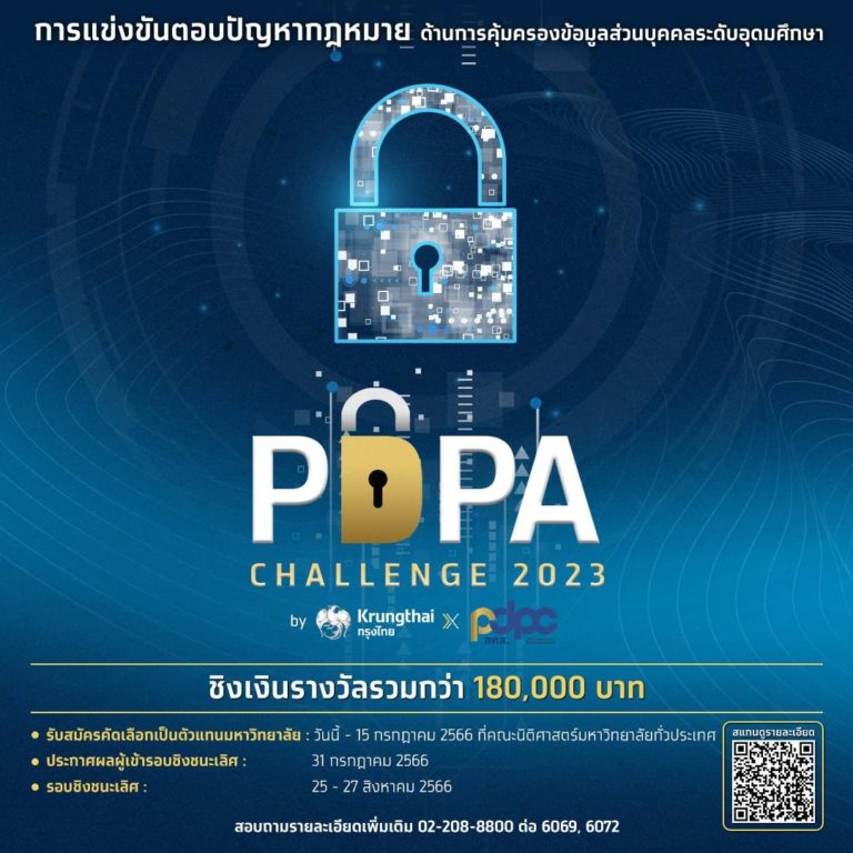 ชวนนักกฎหมายรุ่นใหม่ประชันทักษะความรู้ PDPA ชิงทุนการศึกษา 180,000 บาท ในการแข่งขัน “PDPA Challenge 2023 by Krungthai x PDPC” 21 มิ.ย. 66 11:35