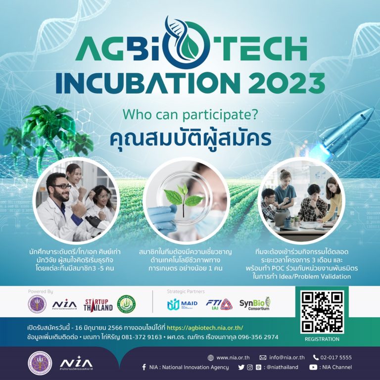 NIA ร่วมกับม. แม่โจ้เปิดรับสมัครทีมสตาร์ทอัพเข้าร่วมโครงการ AgBioTech Incubation 2023 เปลี่ยนไอเดียเพื่อต่อยอดเป็นธุรกิจ นำเทคโนโลยีชีวภาพแก้ปัญหาภาคเกษตรด้วยความแม่นยำสู่ความยั่งยืน 14 มิ.ย. 66 11:16