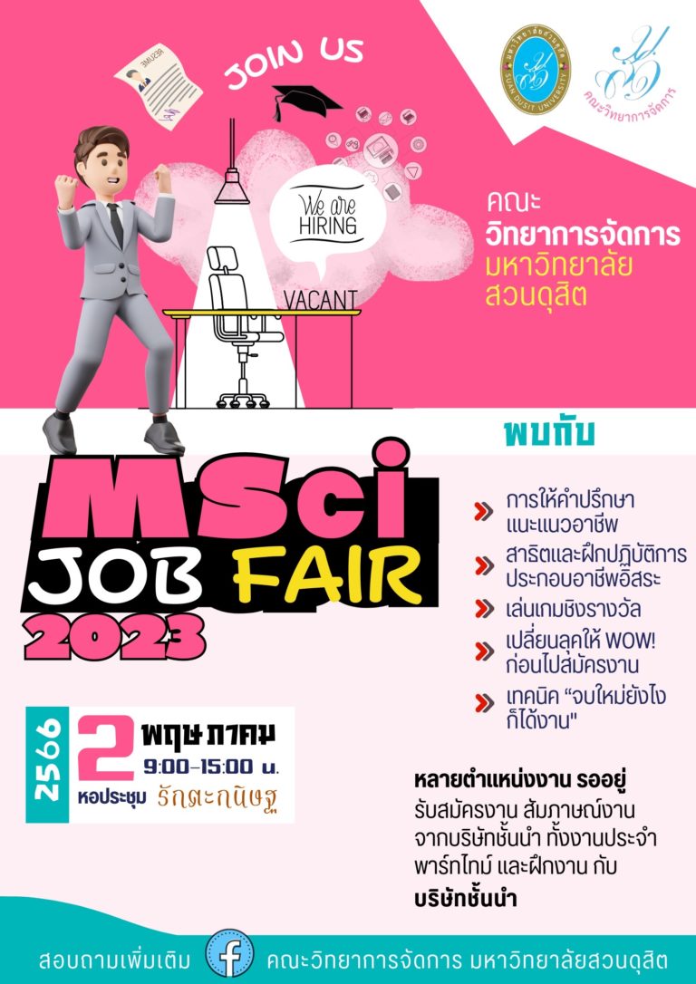 คณะวิทยาการจัดการ มหาวิทยาลัยสวนดุสิต ขอเชิญชวนนักศึกษา และบุคคลทั่วไป เข้าร่วมงาน MSci Job Fair 2023 วันที่ 2 พฤษภาคม 2566 25 เม.ย. 66 16:20