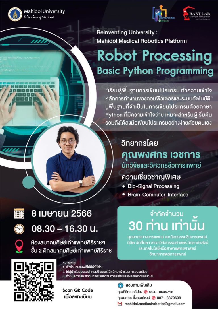 วิศวะมหิดล เชิญร่วมเวิร์กชอปฟรี “การประมวลผลของหุ่นยนต์ – เขียนโปรแกรม Python ขั้นพื้นฐาน” (Robot Processing – Basic Python Programming) สมัครวันนี้ – 5 เม.ย. 66 27 มี.ค. 66 17:09