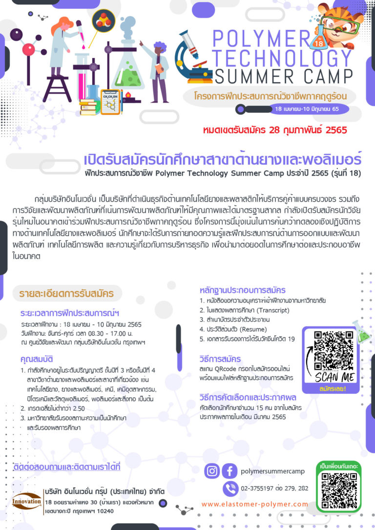 เปิดรับสมัครนักศึกษาสาขาด้านยางและโพลิเมอร์ฝึกประสบการณ์วิชาชีพ Polymer Technology Summer Camp ประจำปี 2566 (รุ่น19) 16 ม.ค. 66 16:10