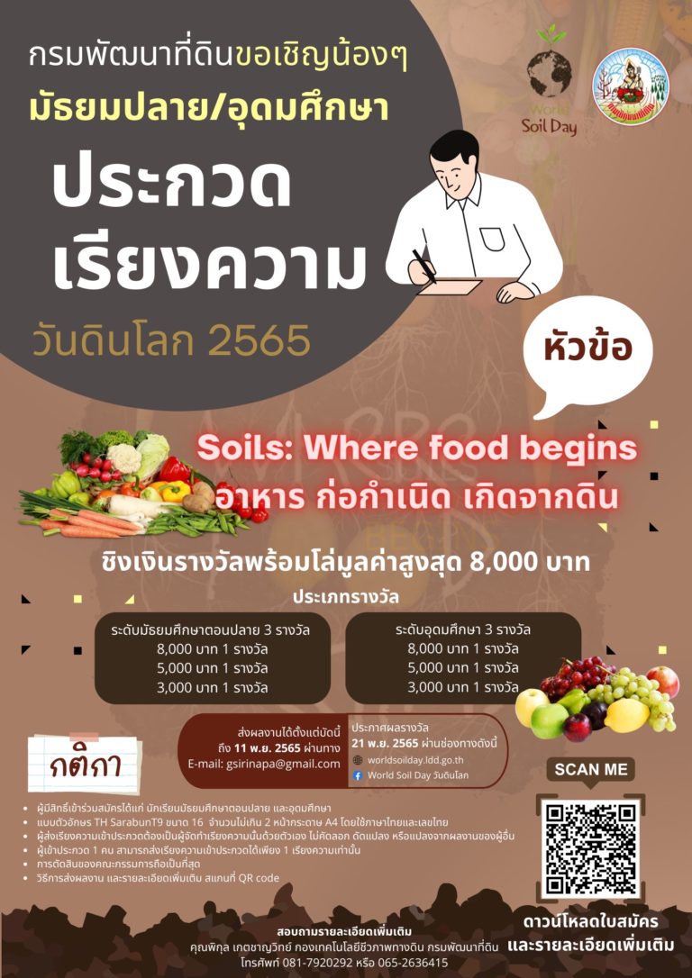 กรมพัฒนาที่ดิน ขอเชิญน้องๆ.. มัธยมปลาย/อุดมศึกษา เข้าร่วมประกวดเรียงความ วันดินโลก 2565 ชิงเงินรางวัลพร้อมโล่ มูลค่าสูงสุด 8,000 บาท 18 ต.ค. 65 12:09