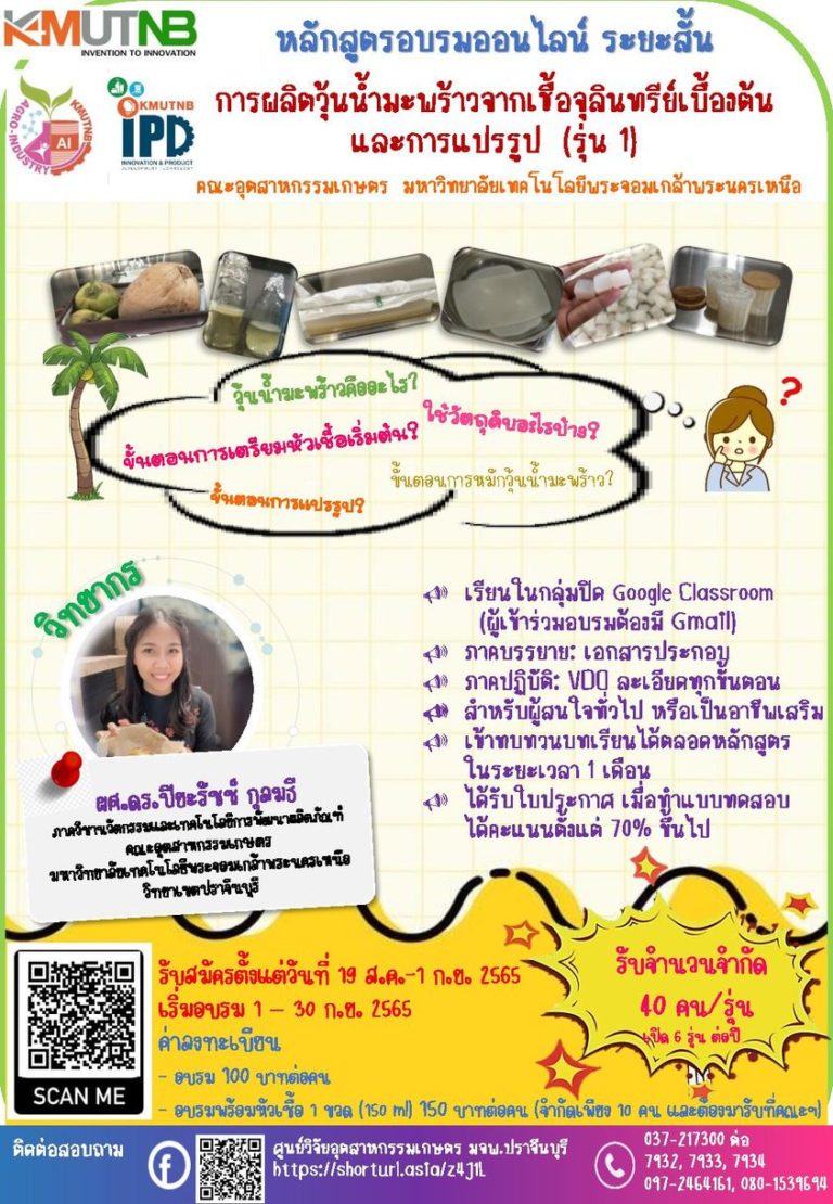 คณะอุตสาหกรรมเกษตร มจพ. เปิดหลักสูตรอบรมระยะสั้น (Non-Degree) สอนทำวุ้นมะพร้าวต่อยอดอาชีพ 23 ส.ค. 65 13:36