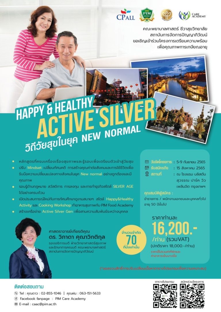 คณะพยาบาลศาสตร์ (School of Nursing) สถาบันการจัดการปัญญาภิวัฒน์ (PIM) ขอเชิญชวน เข้าร่วมโครงการ HAPPY&HEALTHY ACTIVE SILVER : วิถีวัยสุขในยุค new normal (รุ่นที่ 1 / 2565) 1 ก.ค. 65 13:33